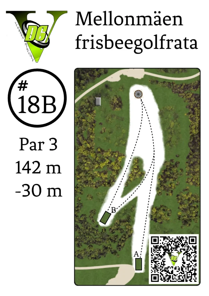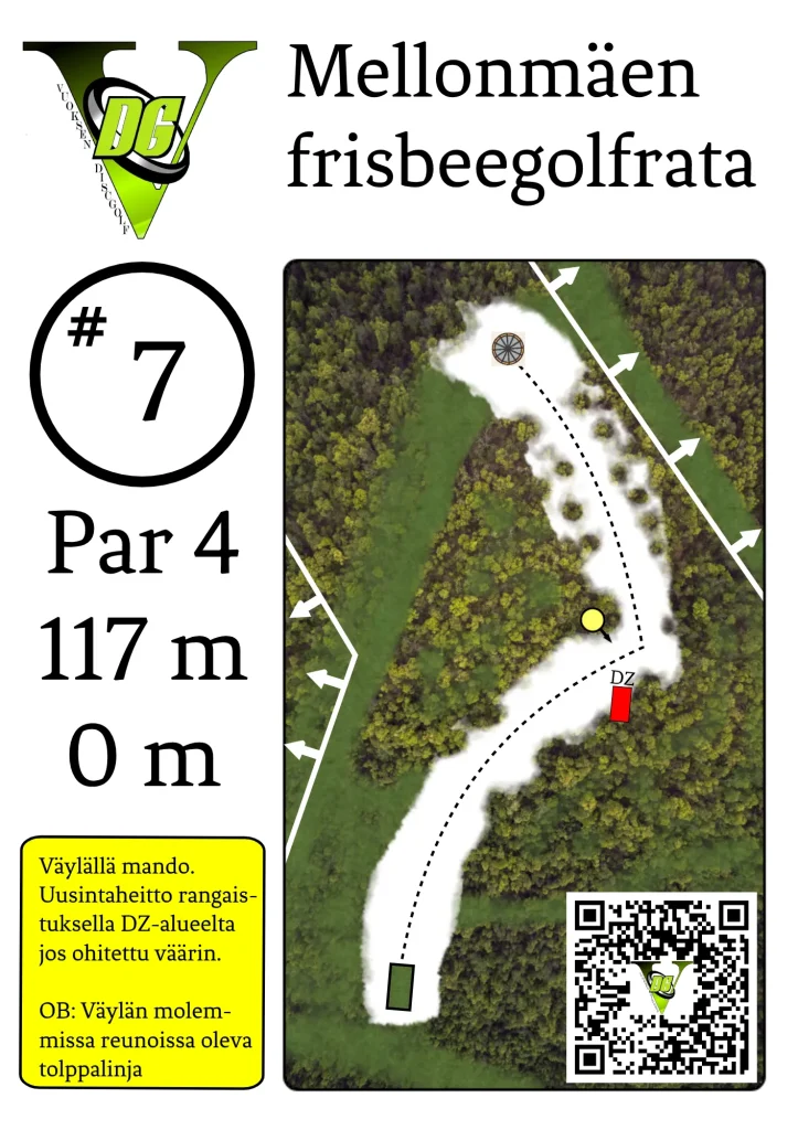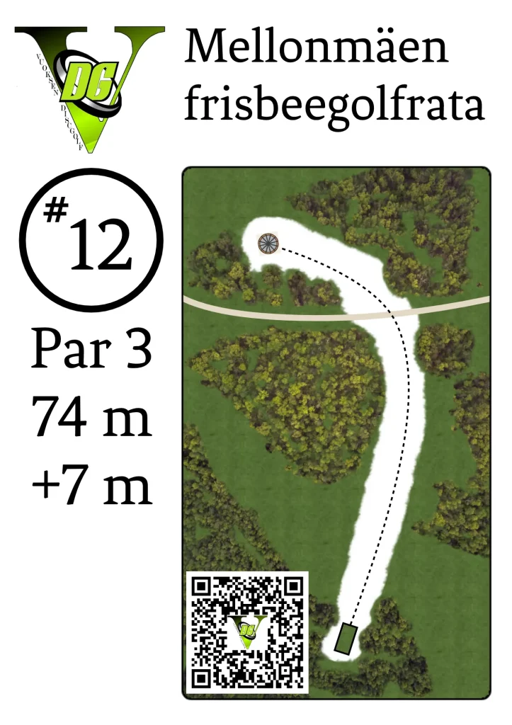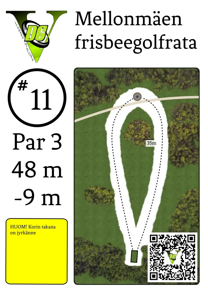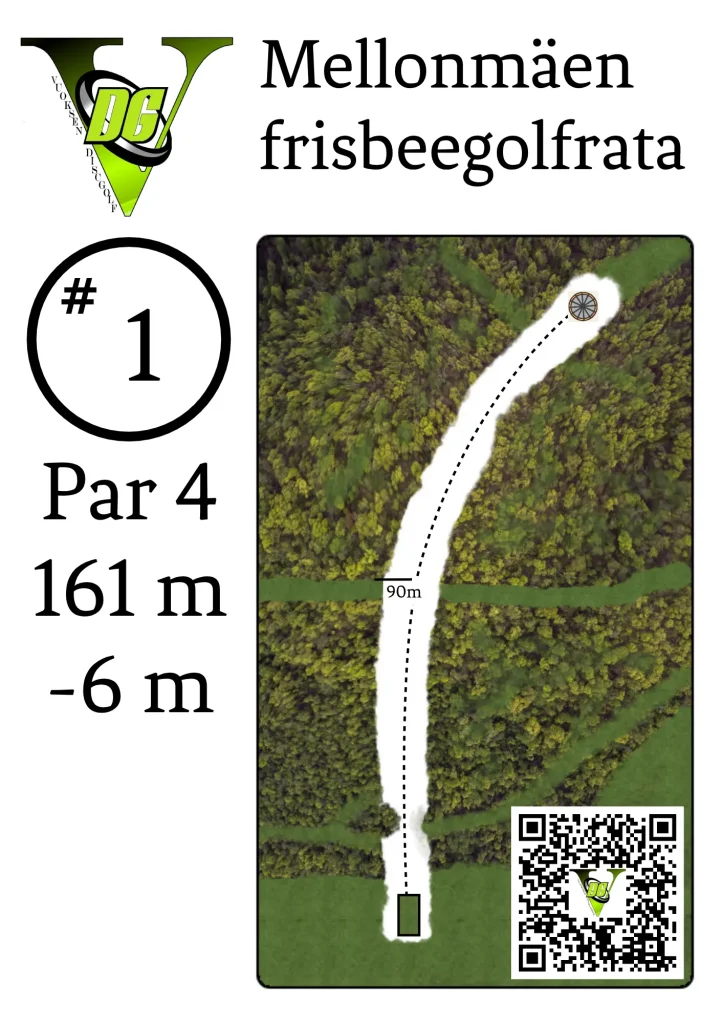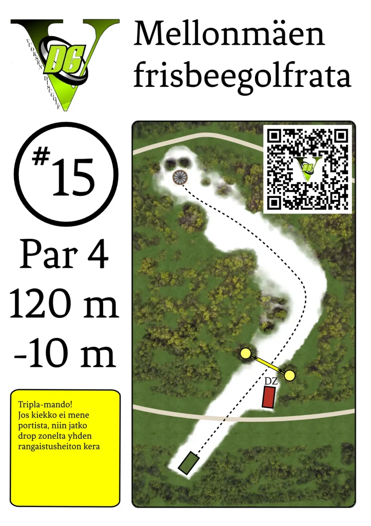 Alamäkeen heitettävä lyhyt väylä. Väylän keskellä olevan puun voi kiertää joko oikealta tai vasemmalta ja väylän haaste on saada kiekko pysähtymään riittävän lähelle koria. Kori on sijoitettu rinteen reunalle ja puiselle tasolle ja penkan reuna on oikeasti jyrkkä. Tästä löytyy siis se Mellonmäen väylä, jossa voi sen kuuluisan “death puttin” laittaa sisään.
