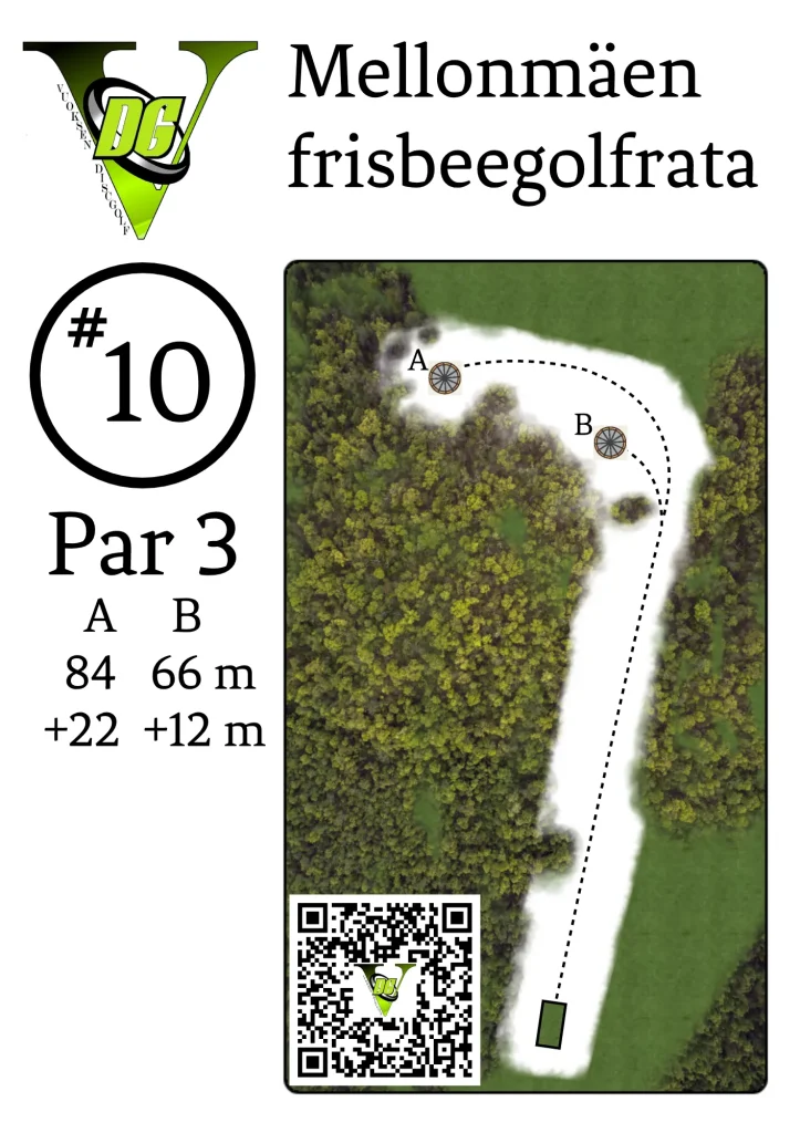 Lyhyt mutta jyrkkä lienee paras kuvaus väylälle 10. B-kori löytyy pienen puskan takaa olevalta tasanteelta ja hyvällä heitolla on hyvin mahdollista saada kiekko nätisti rollereita nappaavan kehikon sisään. Haastetta väylälle tuo kapeahko linja korille ja hyvin jyrkkä rinne. Korille noustessa viimeisille metreille on tehty tasoja, jotka ottavat ainakin osan alamäkeen pyrkivistä kiekoista kiinni. A-kori puuttuu vielä toistaiseksi paikaltaan.