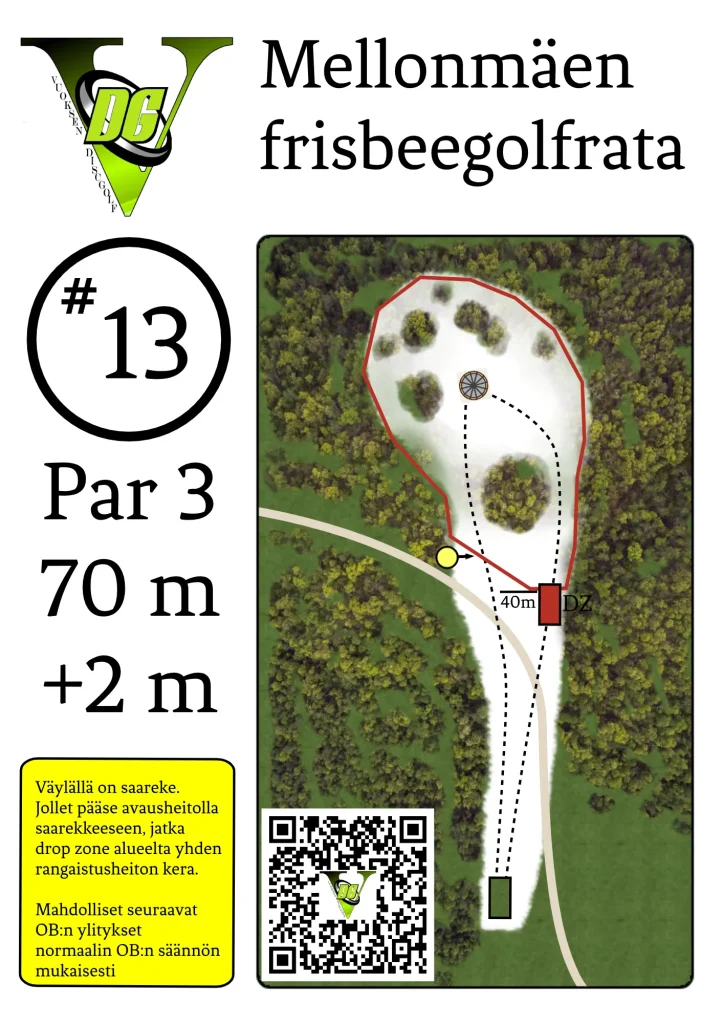 Väylä laskeutuu heittopaikalta nurmiselle koivukujalle. Väylän poikki kulkee 90m kohdalla polku, joten huomioithan alueella mahdollisesti liikkuvat henkilöt. Väylä kaartuu loivasti oikealle polun jälkeen ja kori löytyy koivukujan päästä kahden ojan välistä. Väylän alkuosan vasemmalla puolella on oja ja vesiallas, jonne kiekon saa upotettua.