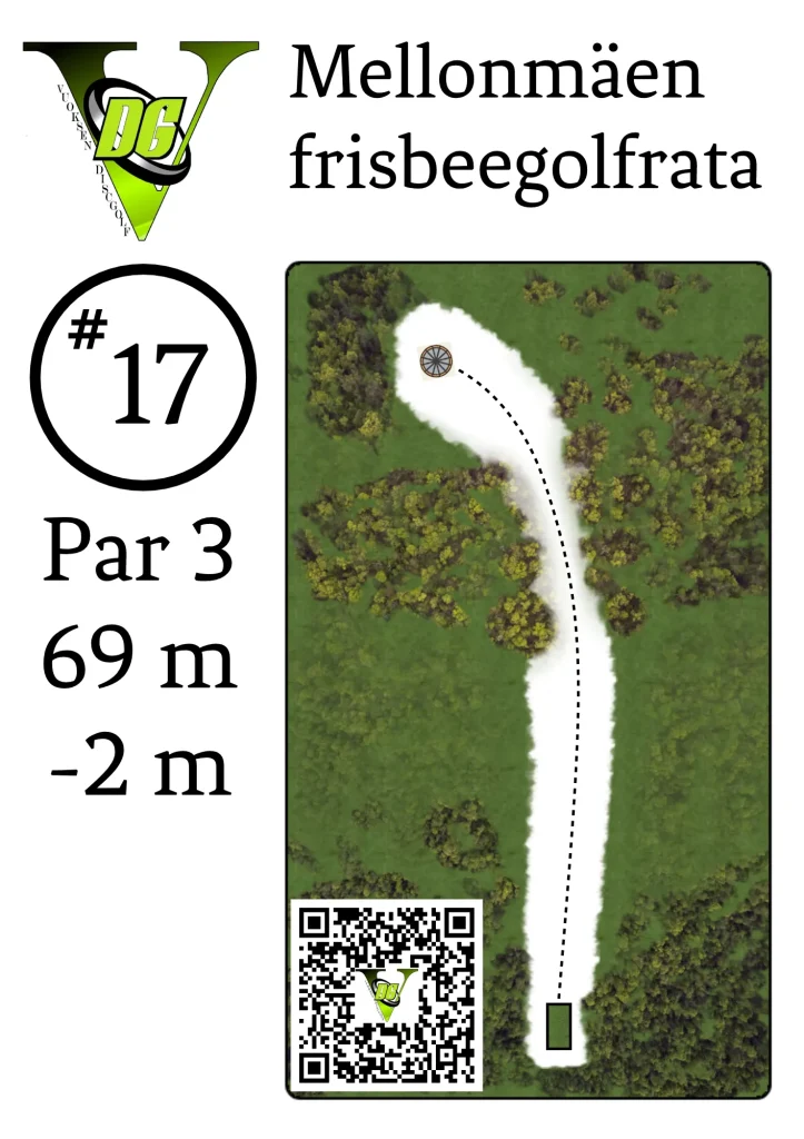 Kunhan osut väylällä 17 puolessa välissä olevien puiden väliin, niin olet jo lähellä koria. Koko matkan tasaisesti vasemmalle kääntyvä väylä, jossa isoimmat ongelmat saa itselleen epäonnisilla puuosumilla. Väylä heitetään poikittain jyrkähkössä rinteessä ja puuosumien sekä mahdollisten rollerien takia on suositeltavaa käyttää spotteria puolessa välissä väylää.