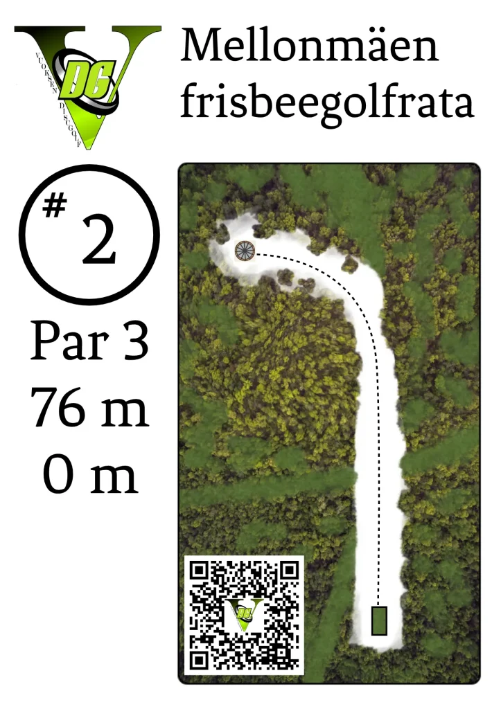 Väylä 2 on aluksi suora, mutta lopussa jyrkästi vasemmalle kääntyvä. Väylän alkuosan poikki menee oja. Kori sijaitsee isojen kuusien suojaamassa taskussa. Hieman pitkäksi menneen avauksen pystyy yleensä vielä pelaamaan hyvin korille, mutta lyhyeksi sisäkurviin jäänyt kiekko on jo synkemmässä mörrissä.