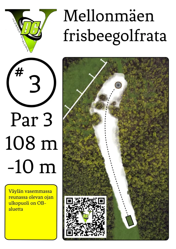 Väylä 3 on suorahko alkuun alamäkeen heitettävä väylä, joka kääntyy lopussa aavistuksen oikealle. Linja korille on suurten kuusien suojaama, mutta kiekon mentäviä rakoja löytyy monestakin kohtaa. Väylän vasemmassa reunassa on väylän 7 kanssa yhteinen OB, jonka yli kiekko helposti livahtaa jos heitto menee liian suoraksi.
