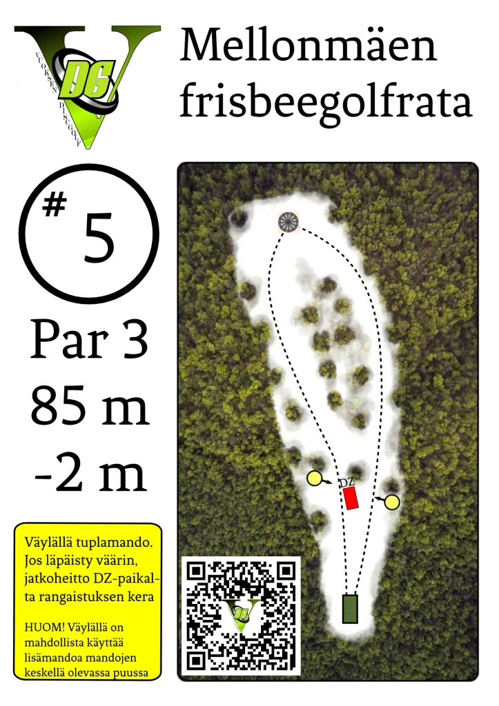 Väylällä 5 on selkeästi kaksi eri heittolinjaa oikeakätiselle joko vasemman puoleista leveämpää linjaa kämmenellä tai oikeanpuoleiseen kapeampaa kujaa pitkin rystyllä. Väylällä on tuplamando, jonka läpäisemisessä tuskin haasteita kohdataan. Puttigreenillä kori löytyy vanhan kuusen kannon nokasta sekä on hieman normaalia korkeammalla ja tämä joskus lisää tarvittavien heittojen määrää.