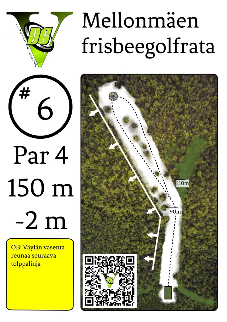 Väylän 6 avaus heitetään tietä pitkin, jonka vasen reuna on OB aluetta. OB alue jatkuu vasemmassa reunassa koko väylän ja OB-linjan takaa löytyy etenkin lähempää koria hyvin vetinen alue. Avausheiton tulisi kantaa noin sata metriä lopussa vasemmalle kääntyen. Kurvin jälkeen edessä on valittavissa kaksi kuusikujaa korille ja hyvän avauksen jälkeen useampi eagle on tältä väylältä pystytty nappaamaan.