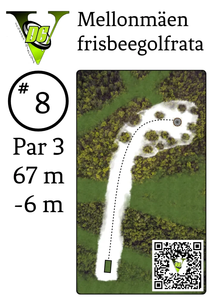 Vaikka väylä 8 onkin hyvin lyhyt niin se ei siitä automaattisesti helppoa tee. Avausheitto heitetään pieneen alamäkeen ja ojan jälkeen väylä kaartaa jyrkästi oikealle. Heitto menee todella helposti pitkäksi tai liian aikaisin feidatessa kopsahtaa sisäkurvin puihin.