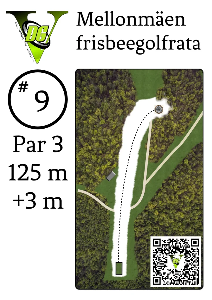 Jo vähän pituutta vaativan väylän 9 kori näkyy heittopaikalle hyppyrimäkeen nousevien portaiden alkupään oikealla puolella. Ison kämmenheiton omaavalle oikeakätiselle tai vasurin rystylle luonteva linja, mutta oikeakätinen rystyheittäjä saa taittaa heiton juuri sopivasti jotta ei ajaudu metsään oikealle tai liian aikaisin hyppyrimäen rinteeseen. Väylän alkuosan poikki kulkeva polku on lenkkeilijöiden ja pyöräilijöiden aktiivisessa käytössä, joten ennen heittoa varmista ettei alueella ole ulkoilijoita.
